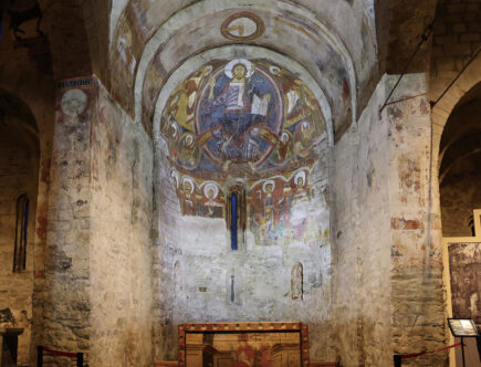 1123年献堂のロマネスク教会。MNAC収蔵の壁画をビデオマッピングで再現し、鐘楼や夜間ライトアップとともに中世の祈りの空間をリアルに体感できます。