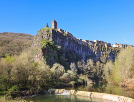 玄武岩の断崖の上に築かれた特異な立地を持つカステルフォリ・デ・ラ・ロカ。細長い岩壁の上に家々が並ぶ景観は、ガロッチャ地方を象徴する風景のひとつです。