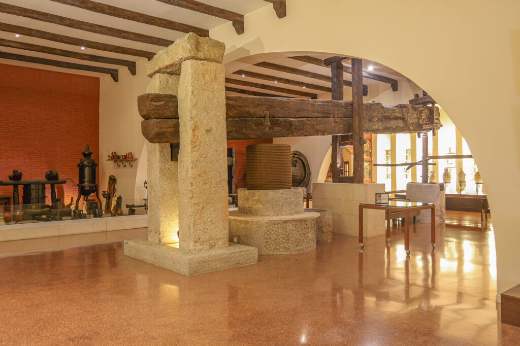 敷地内にはトーレス家の歩みを伝えるミュージアムやセラーがあり、歴史的な建物の中に最新設備が共存しています。周囲にはプリオラートやペネデスのブドウ畑が広がり、遠くにはモンセラットの山並みを望むことができます。自然と人の営みが織り成すこの風景そのものが、トーレスの理念「自然と共にある」を語っています。