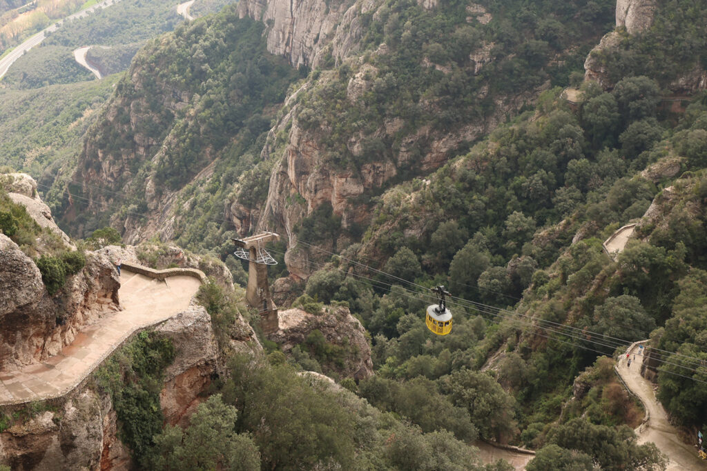 修道院へと向かう過程そのものを特別な体験に変えてくれるのが、アエリ・デ・モンセラットです。1930年に開業した歴史あるロープウェイで、黄色いゴンドラは今も当時のレトロなスタイルを踏襲しています。麓の駅から修道院近くまでをおよそ5分で結び、標高差約500mを一気に駆け上がる。断崖を縫うように進む空中散歩は迫力に満ち、ゴンドラ越しに近づいてくる修道院の姿は、陸路とはまったく異なる印象を与えます。修道院付近までクルマで行くことも可能ですが、あえて麓のロープウェイ駅にクルマを停め、空から聖地へと近づいていくという選択によってモンセラット訪問をより一層ドラマチックなものにしてくれます。