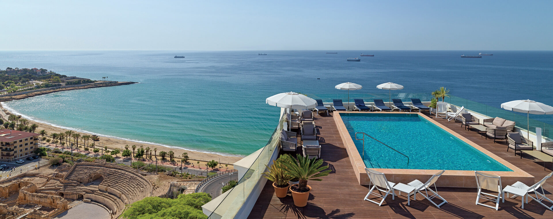 美しい地中海と古代ローマ遺跡が重なり合う独特の景観が広がるタラゴナ。世界遺産にも登録されるこの歴史都市の中心で、海に向かって堂々と建つのが「H10 インペリアル タラコ(H10 Imperial Tarraco)」です。ローマ時代の円形闘技場跡のすぐ隣にあり、客室のバルコニーからは遺跡と地中海を同時に見渡すことができるという素晴らしい眺望が自慢のホテルです。タラゴナならではの、まるで絵画のような絶景を存分に楽しむことができる、数ある地中海沿岸のホテルの中でも特別な存在です。