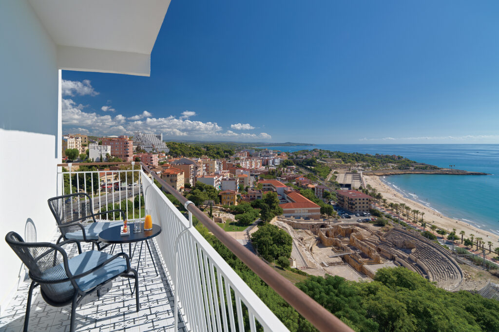 客室はすべてバルコニー付きで、家具や照明は落ち着いたトーンで統一され、旅の拠点として心地よく過ごせるデザインに仕上げられています。とくに海側の客室は、このホテルの大きな魅力です。バルコニーに出ると、眼下にはローマ時代の円形闘技場が広がり、その向こうには海風を受けて揺れる地中海が見渡せます。朝には柔らかな光が遺跡を照らし、夕暮れには海面が金色に染まり、時間帯によってまったく異なる表情を見せてくれます。歴史と自然がそのまま風景となって流れ込んでくるような眺望は、タラゴナならではの特別な宿泊体験になるでしょう。