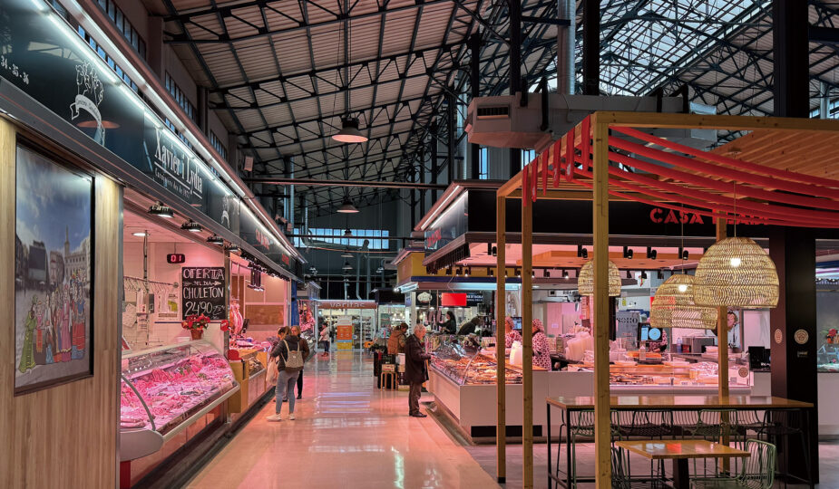 1949年竣工の合理的モダニズム空間に約150店。レウス住民の台所で、オリーブオイルや生ハム、惣菜を買い歩きできる。朝の活気を体感する市場散策がおすすめ。