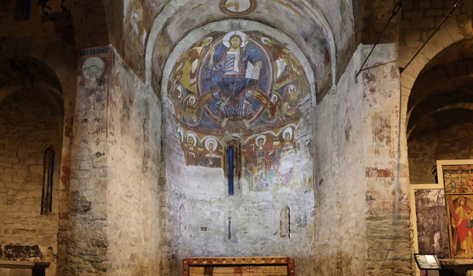 1123年献堂のロマネスク教会。MNAC収蔵の壁画をビデオマッピングで再現し、鐘楼や夜間ライトアップとともに中世の祈りの空間をリアルに体感できます。
